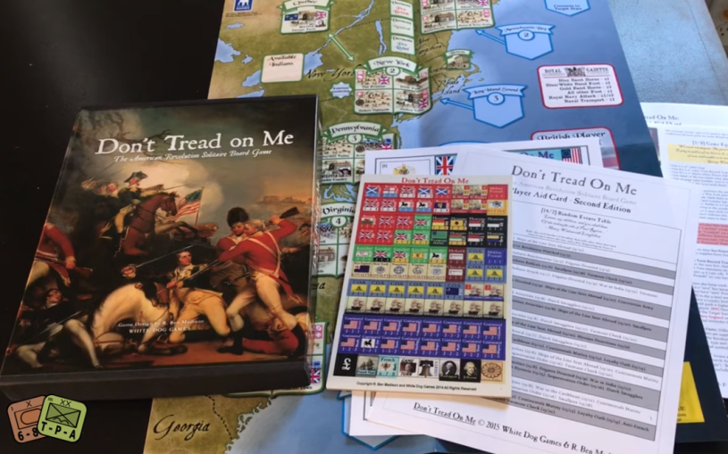 Don’t Tread On Me is a strategic-level solitaire simulation of the American Revolution published by White Dog Games. The game system is based on the popular Vietnam Solitaire: Special Edition game system from White Dog Games and is designed by R. Ben Madison and developed by Wes Erni. The player of this solitaire game plays the British side along with American “Loyalist” forces against the A.I. forces of George Washington and the Continental Congress. The game features a number of innovative elements including political control, state loyalty levels (which can change), and an off-map system to show the presence of militia forces in a battle. This edition has a 2nd edition map that is a major improvement over the original map published in 2014.