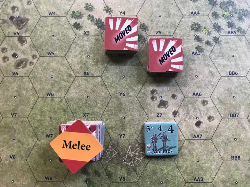 Sgt. Miyake now moves as far as he can which is 4 hexes but cannot get adjacent to the Marines Unit on the right. The Rifle Unit activated by Sgt. Miyake also moves it’s full movement and has to stop shy of the adjacent hex to enter Melee with the Marine. That is ok as they can activate next round and continue with their Banzai Attack. My guess is that the American player will want to either retreat or might try to bring a Fire Attack on the approaching Japanese. The Japanese activation is now complete and the round will continue allowing each player to spend their Impulse Points but the Units engaged in Melee cannot move, attack or be attacked at this point.