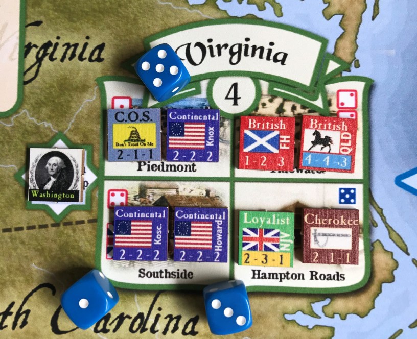 After all of that, if Washington is in play, the player will have to now determine which of the three Middle States, including New York, Pennsylvania and Virginia, that Washington will be moved to. The State containing the most British Units will be where Washington is moved and his counter will be placed into the American Leadership Box found to the left of each of these three States. If two of the three States are tied with the same amount of British Units or all three have no British Units in them, Washington will be placed into the Target State for the turn if that Target State is found among the Middle States. If none are the Target State, then the player will roll a die to break the tie.