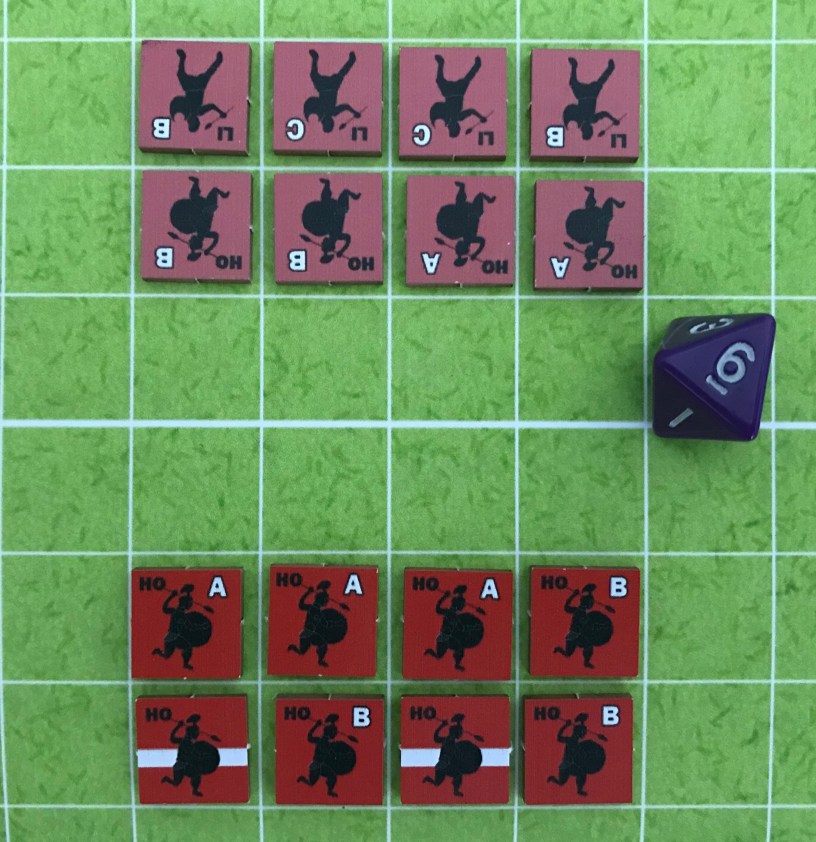 At the time that Foot Units on opposing sides become adjacent to each other and are Facing one another they are now considered to be Engaged. Not to be married, but to go about the work of death and destruction as they enter melee. Once Engaged, these Units cannot move and when they become Engaged those Units stop their movement. There is no charging overrun in this one. If there are multiple Wings that have advanced over a few turns, the enemy Units that are laterally adjacent both to the left or the right are