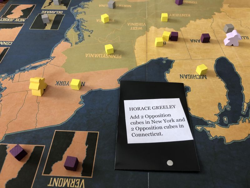 Discarding a card to take a Legislative Vote action only happens in the last two turns, which occur between 1919 and 1920. The player selects specific states to hold a vote on ratification. For each state, each player rolls a six-sided die, then adds any influence markers in the state and any bonuses from cards.