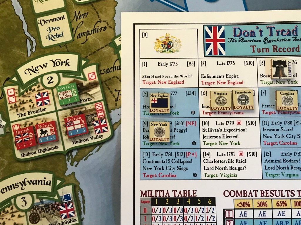 If the roll happened to be a 6, then Congress will remain in Flight and the player moves the Liberty Marker one box to the left, which remember is a good thing for the player as you want to keep Liberty low in order to win the game. Once Congress convenes in any State, reduce that State’s Loyalty by -1. But if Congress convenes in Virginia, also add +1 to the Loyalty of Pennsylvania, New York and New England. If Congress convenes in New York, then add +1 to the Loyalty of Pennsylvania, Virginia and