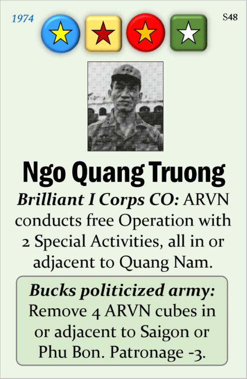 Truong’s brilliance grants flexibility to the ARVN in their defense of I Corp, allowing ARVN to mix and match 2 Special Activities with any Operation. Depending on the eligibility and situation on the map, the ARVN and US player can use Ngo Quang Truong to devastate an NVA offensive.