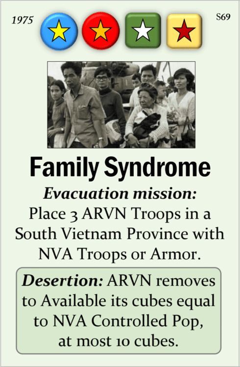 Family Syndrome is devastating to the ARVN player and can strip the defenses from Saigon for a late NVA push. This card reflects a trend in the 1975 deck, with many cards that do not clearly enable ARVN but provide massive benefits to the NVA/VC. If the ARVN and US players collude, Family Syndrome could be used to remove a vulnerable NVA Armor, but at the cost of two activations. VC players will need to be cautious with this event – it may benefit the NVA too much if taken without much thought – and they may wish to block it (or be persuaded by the ARVN to block it).