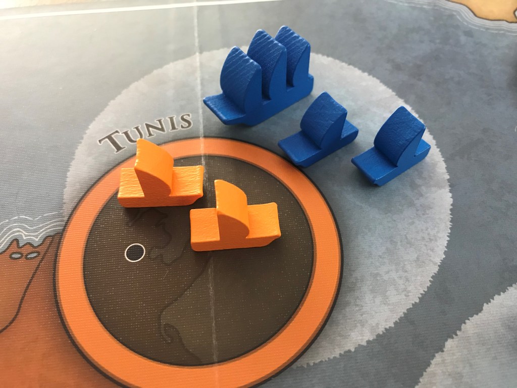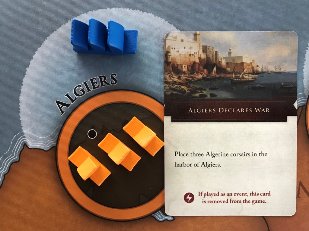 At setup, the Tripolitan player will place two Corsairs in the harbor of Gibraltar and four Corsairs in the harbor of Tripoli. These Corsairs can be created by discarding a card and the new Corsair must be placed in Tripoli.