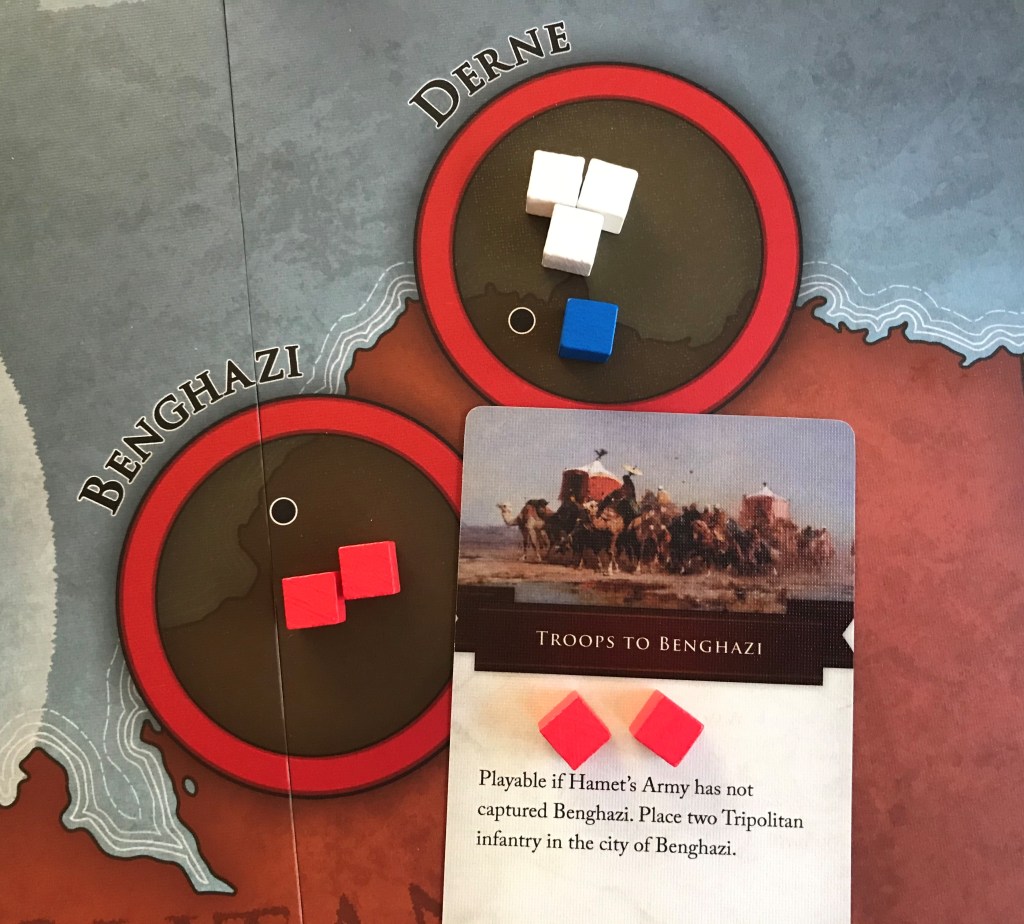 At setup, the Tripolitan player will place four Infantry in Tripoli and two each in Benghazi and Derne. There are a few cards that if played for the Event will create new Infantry units but these are limited to being placed in named cities and only if they have not been captured by Hamet’s Army.
