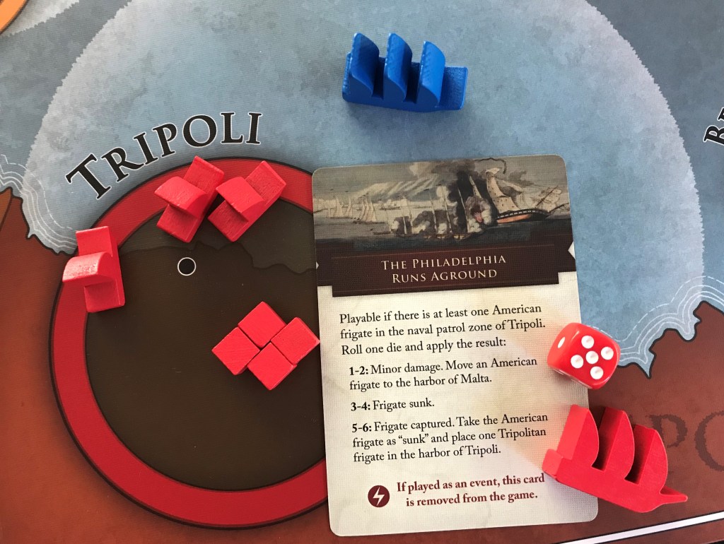 The only way that the Tripolitan player can actually gain a Frigate is through the play of The Philadelphia Runs Aground card as an Event. The card requires that at least one American Frigate is located in the naval patrol zone of Tripoli in order to be played. The Tripolitan player then rolls a die and if the result is a 5 or 6, they take the American Frigate as sunk (this is one of their victory conditions to sink four American Frigates) and then place one of their two available Frigate pieces in the harbor.
