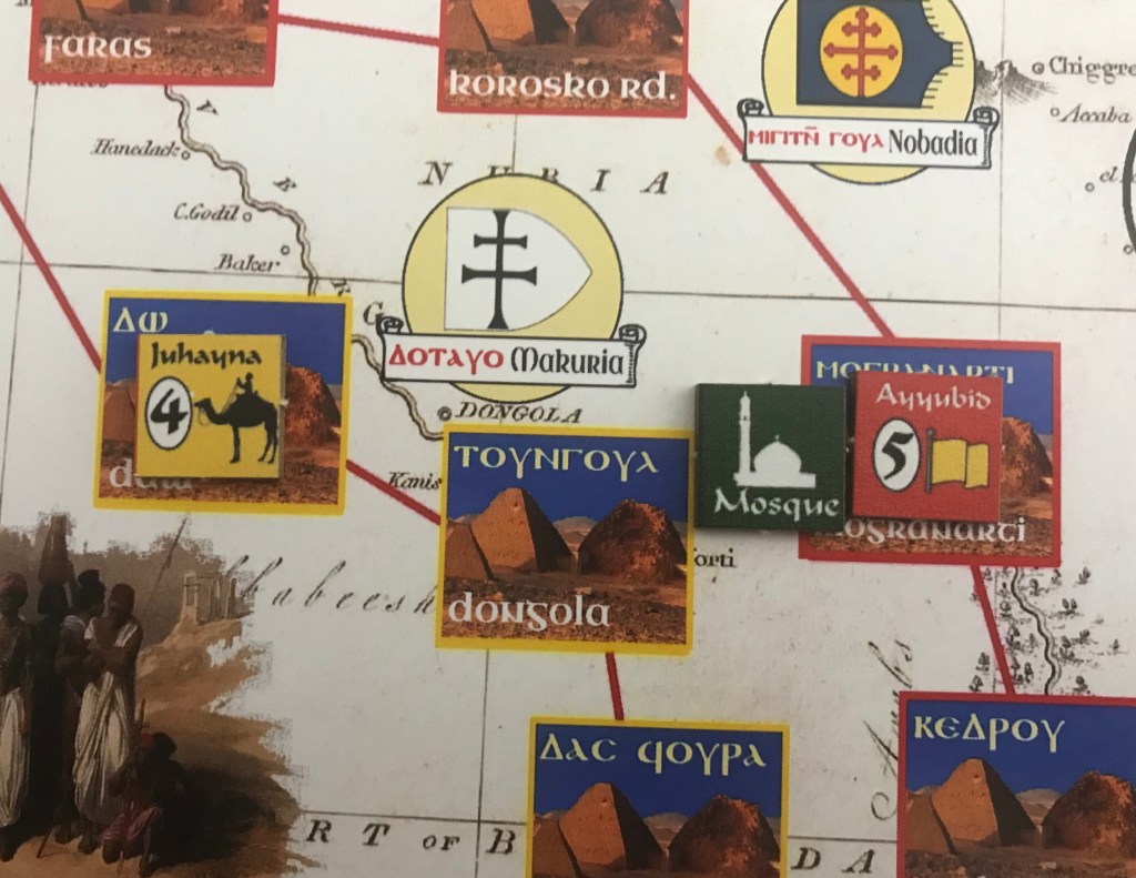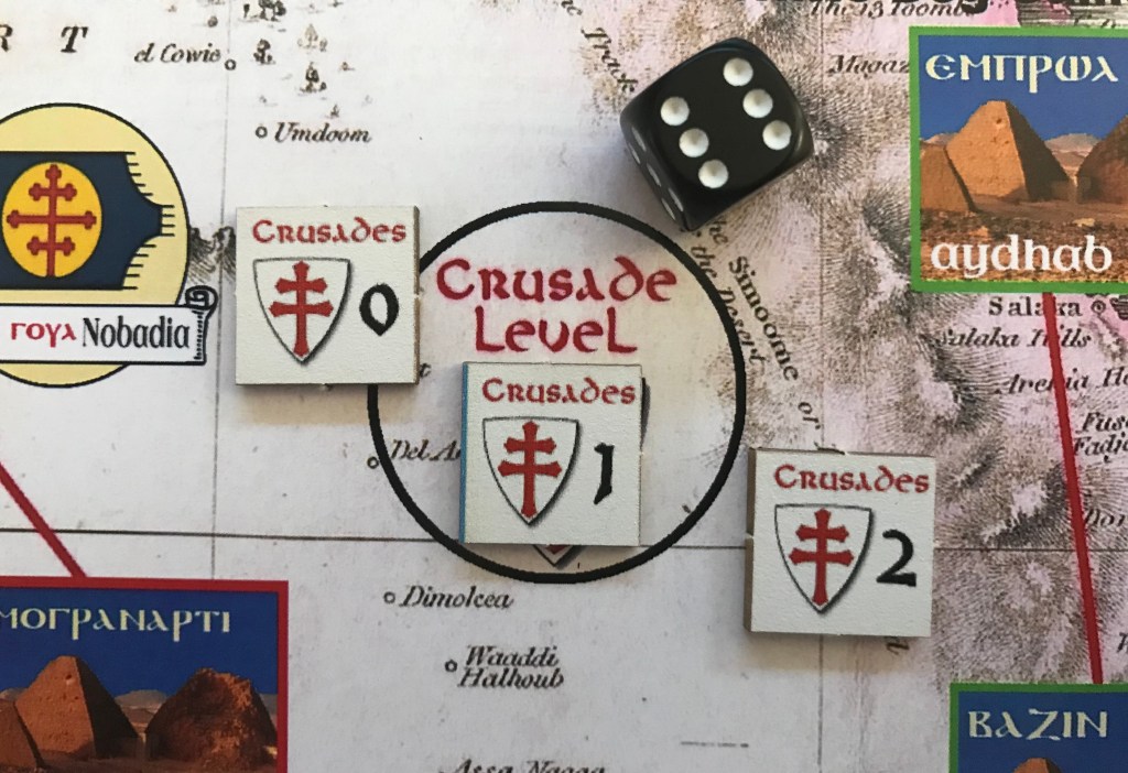 Crusades – The player will roll a die to see how the ongoing Crusades are going at the other end of Egypt. On a roll of 1-4, the Crusade Level will be set at 2, on a 5 it will be set at 1 and on a 6 it will be set at 0. Setting the Crusade Level means replacing the existing Crusade Tile in the Crusade Box with the one matching the result. This level will effect the Land Sales by penalizing the revenue by reducing it by the Crusade Level. So if the Crusade Level is at 1 and the player sells the 4 Land Tile, they will only gain 3 Efforts rather than 4. The distant Crusades, while not fought in or around the Kingdoms of Nubia, disrupted Arab trade and travel near Egypt. As the Crusades waned, the Arabs would focus more on attacking Nubia and less on protecting themselves.