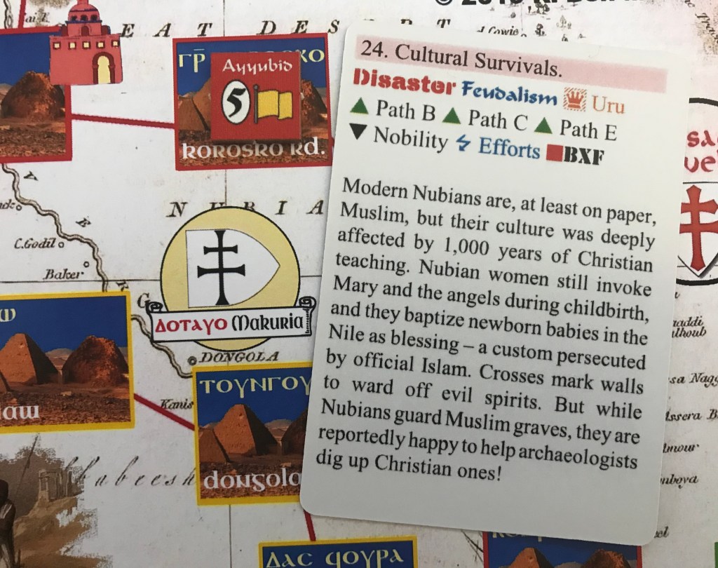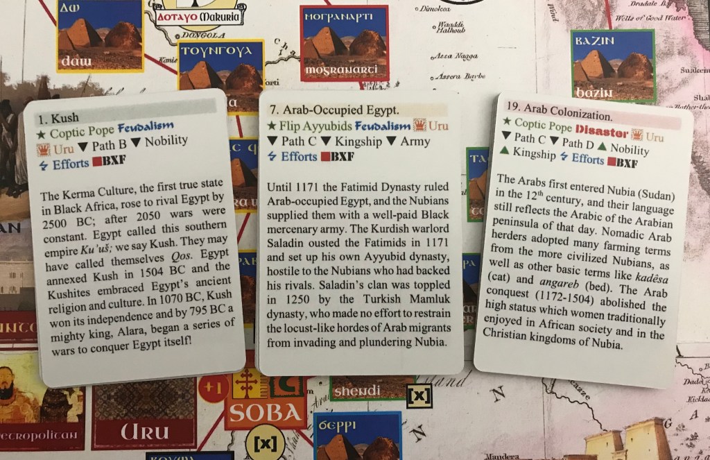 The game includes a deck of Event Cards that are used to represent the different eras of the history of the Nubian Kingdoms from the game’s beginning period of 1172 AD to its end in 1504 AD. Each single card represents a period of approximately 14 years and the card constitutes an entire game turn.