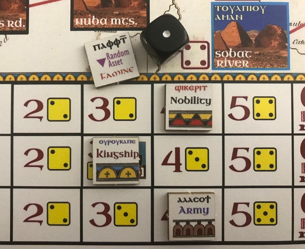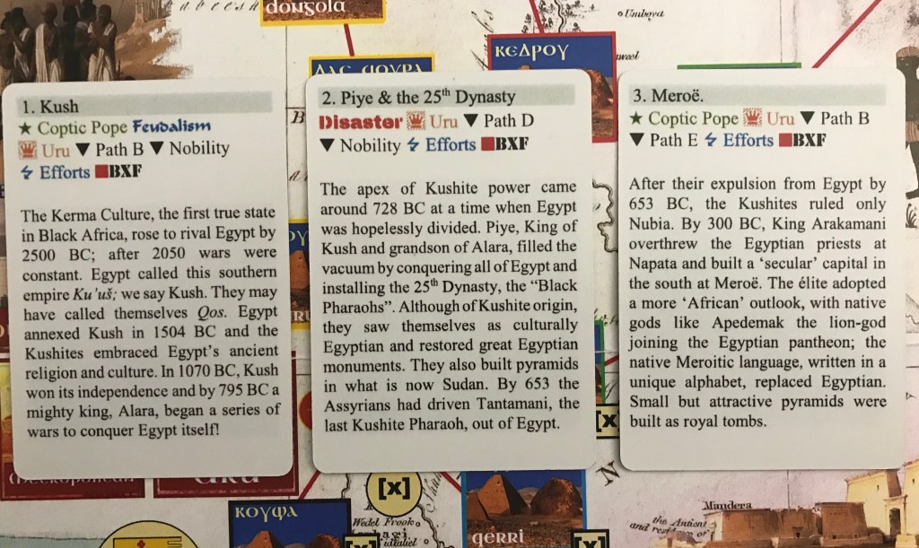On almost every single card there is listed one of these Special Events. These Special Events are denoted on the card with a star preceding the title. They represent different aspects of the struggle of the Nubian Kingdoms that are really out of the control of the player. Some are good while some are bad.