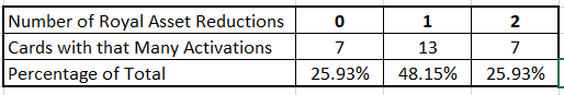 The cards may also direct the player to reduce a Royal Asset by moving that Royal Asset Tile, either Nobility, Kingship or Army, down one box to the left. The cards sometimes direct just one Asset to be reduced but also can do 1 or 2. Here is a breakdown of how many instances of cards that direct for the reduction of 0, 1 or 2 Royal Assets: