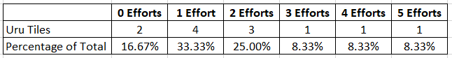 As you can see, there is quite a spread of results and this part of the game is very interesting and a bit tense as if you do not consistently get 2-3 or more Efforts each turn you will find that you cannot keep up with the continual onslaught by the Meks and the results of Famine and Disasters as your Royal Assets will be whittled away. All told, there are only 2 total Uru Tiles or just 16.67% of the total tiles in the Draw Cup that do not give any Efforts, but I swear those seem to come up more often that you would think. As you have to thin this pool out over the course of the game due to Collapse Checks, Defections and the Crown Prince losing battles with the Meks and other issues that arise, if you have to discard one of the better producing Uru Tiles then the percentage of poor ones will increase and you will find yourself drawing them more often. Normally, I will lose the 5 Effort Uru pretty quickly it seems then followed by one of the other goods ones. It is all about the draw and it is random so you never know what you will get.