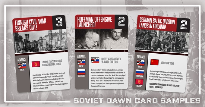 Darin: The only faction you have to control is the Bolshevik leadership. But there are an ever shifting array of enemy factions to deal with, ranging from the Imperial Germans, the First World War Allies, the Finns, the Poles, and the White Russian armies in Siberia, the Ukraine, the Baltics, and the Crimea. Additional factors are modeled within the cards themselves, ranging for the Social Democrats, the Komuch, the Turks in the Caucasus, and even Nestor Mankho and his “green” anarchists.