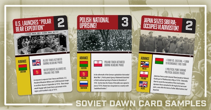 Darin: Soviet Dawn is the favorite game I designed. One of the reasons is theme. In college, I studied the Russian Revolution and was so captivated by the Russian Civil War. When I tried to think of an historical system with a central point of concentration and complete chaos, the subject matter just reached out to me. I also felt that it was a subject that had not been tackled that well in existing game designs.