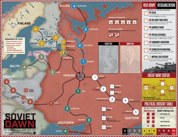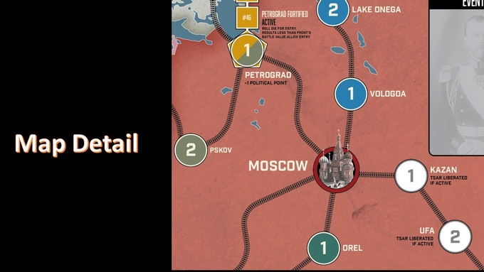 Moscow is situated in a central position. If any enemy manages to capture Moscow, the regime falls and you lose. But, that’s only the military aspect of things, because you also have to manage political affairs amidst squabbling leftist factions, the loss of important geographic centers, foreign meddling, and much more. If you can survive all three decks without losing Moscow you win. If you can survive to improve your political standing to the top of the index, then you also win by achieving diplomatic acceptance of your regime. Lose Moscow or collapse politically and its all over, but you can try again.