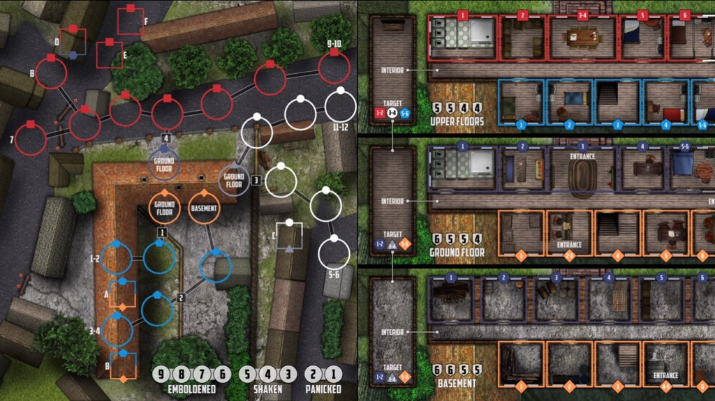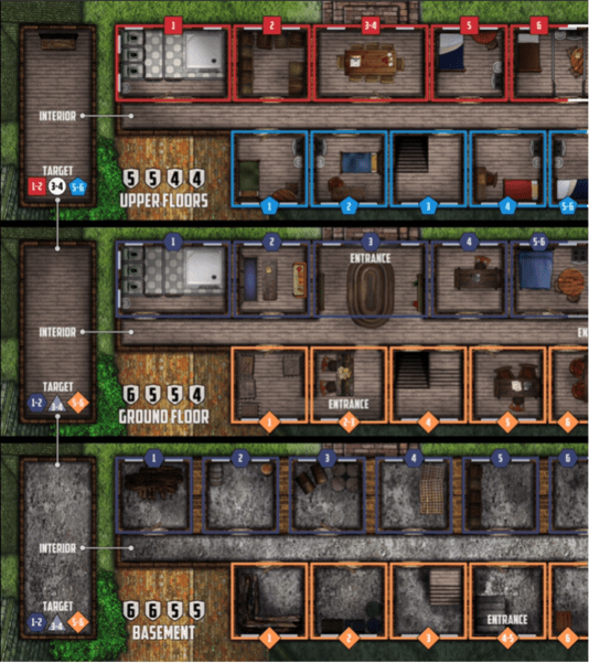 David: The post office is divided into three sections: the upper floors, the ground floor, and the basement. Within each of these sections is an interior space and combat positions. The layout is based on the actual configuration of the post office, taken from blueprints of the building. Smaller combat positions can be occupied by two Defenders, while larger combat positions can be occupied by three Defenders. There is no limit to the number of Defenders (and Enemies) that can be in the interior spaces.