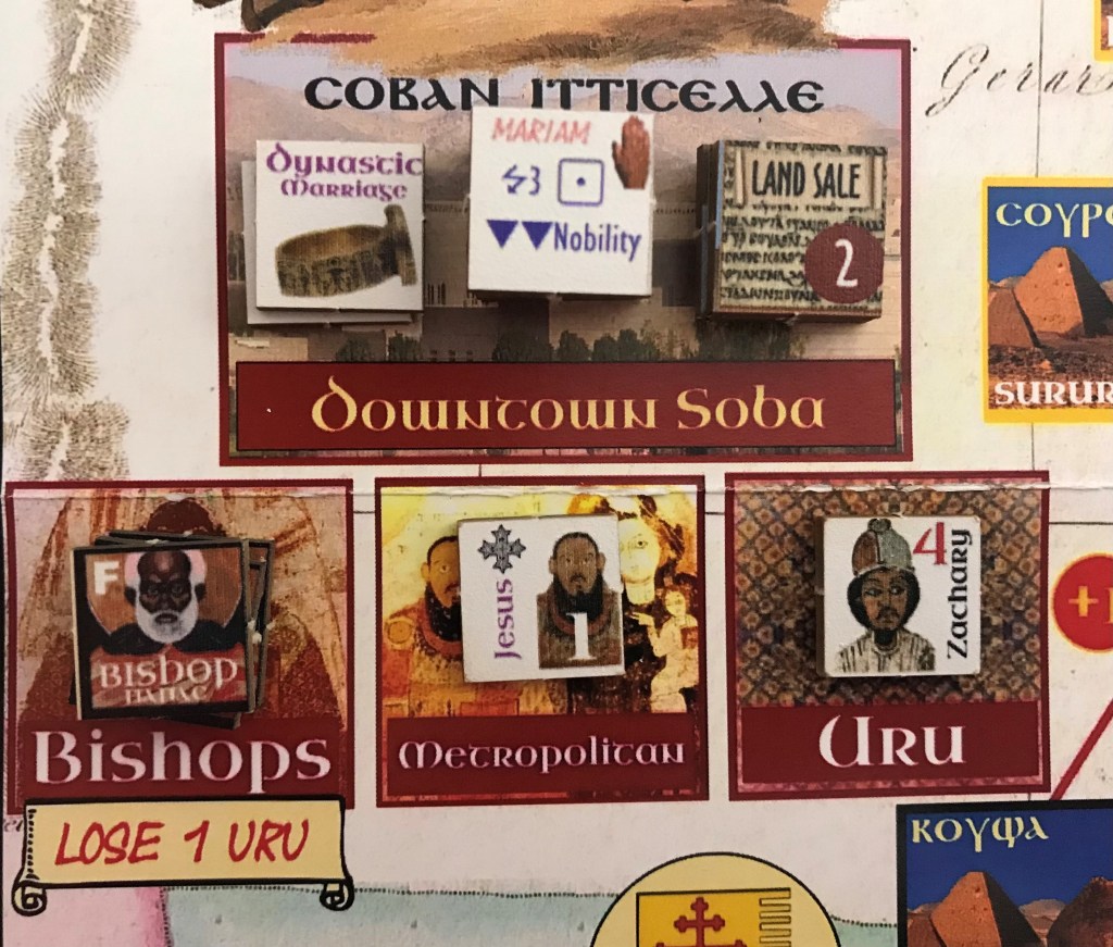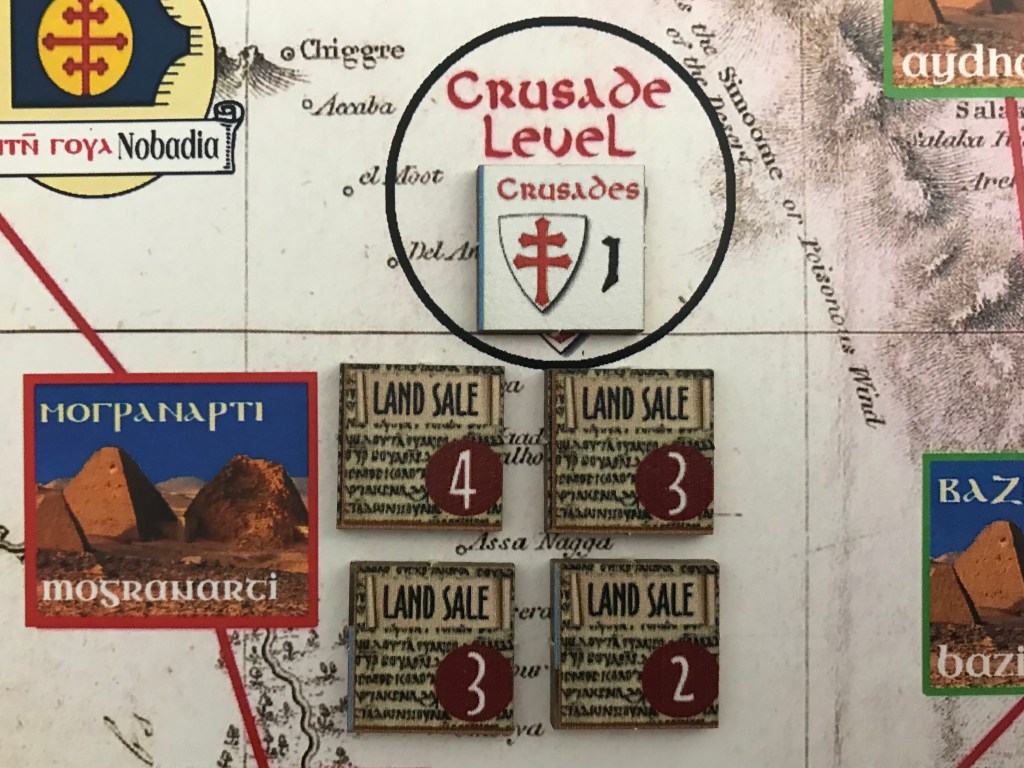 We covered this briefly in Action Point 1, but located between Path B and C is positioned the Crusade Level Round Box that will change throughout the game and is connected to the Land Sale Tiles in the Downtown Soba Boxes. There are a few Event Cards that direct the player to roll a D6 to determine the Crusade Level. This Crusade Level is representative of how the Crusades are going in the Holy Land and how it is effecting things in Nubia. The Crusade Level has 3 different levels; 0, 1 and 2. The higher the number, the poorer that the Crusades are going for the Christians and the Muslims are diverting their attention toward other goals, namely spreading into Africa and buying up valuable land along the Nile. When the player decides to sell land to gain additional Efforts by selling a Land Tile they will have to reduce the final number of Efforts earned by the Crusade Level. So, for example, if they sell a 4 Effort Land Tile while the Crusade Level is at 1, they will only net 3 additional Efforts as they have to reduce the number by the Crusade Level. This Crusade Level is hard to control or manipulate so don’t fret over this but simply be ready to sell when the Crusade Level is in your favor as it may change.