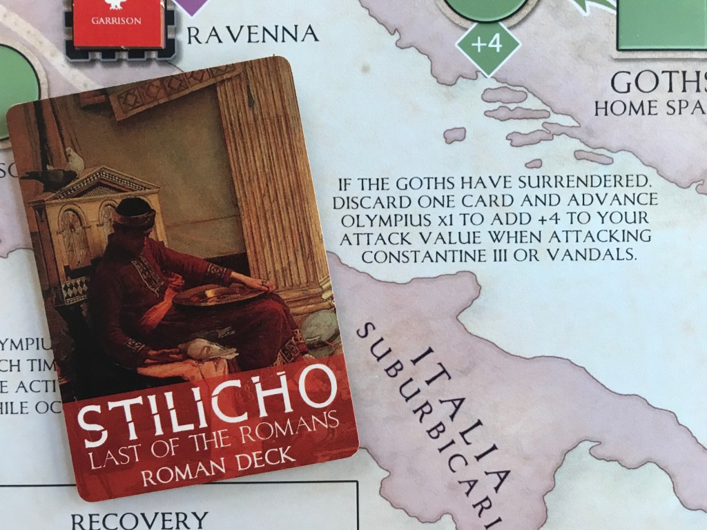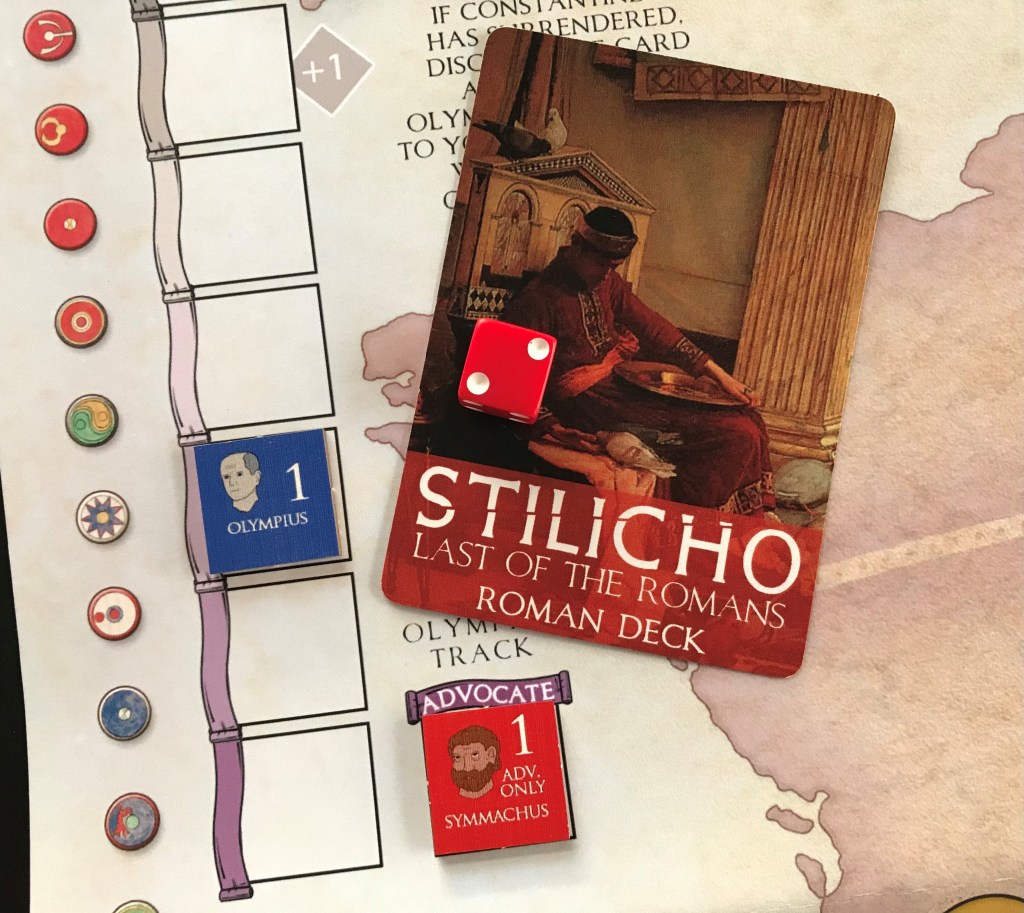 Olympius can really be the source of a lot of trouble as if he reaches the end of his track you will lose your head and this is sometimes out of your hands as he can be moved from you rolling a 1 on an Attack led by Stilicho, from Enemy Event Cards or from Surge Effects. You simply cannot let this get out of control and I feel that you must address this before the Difficulty Values on the track increase to above +1.