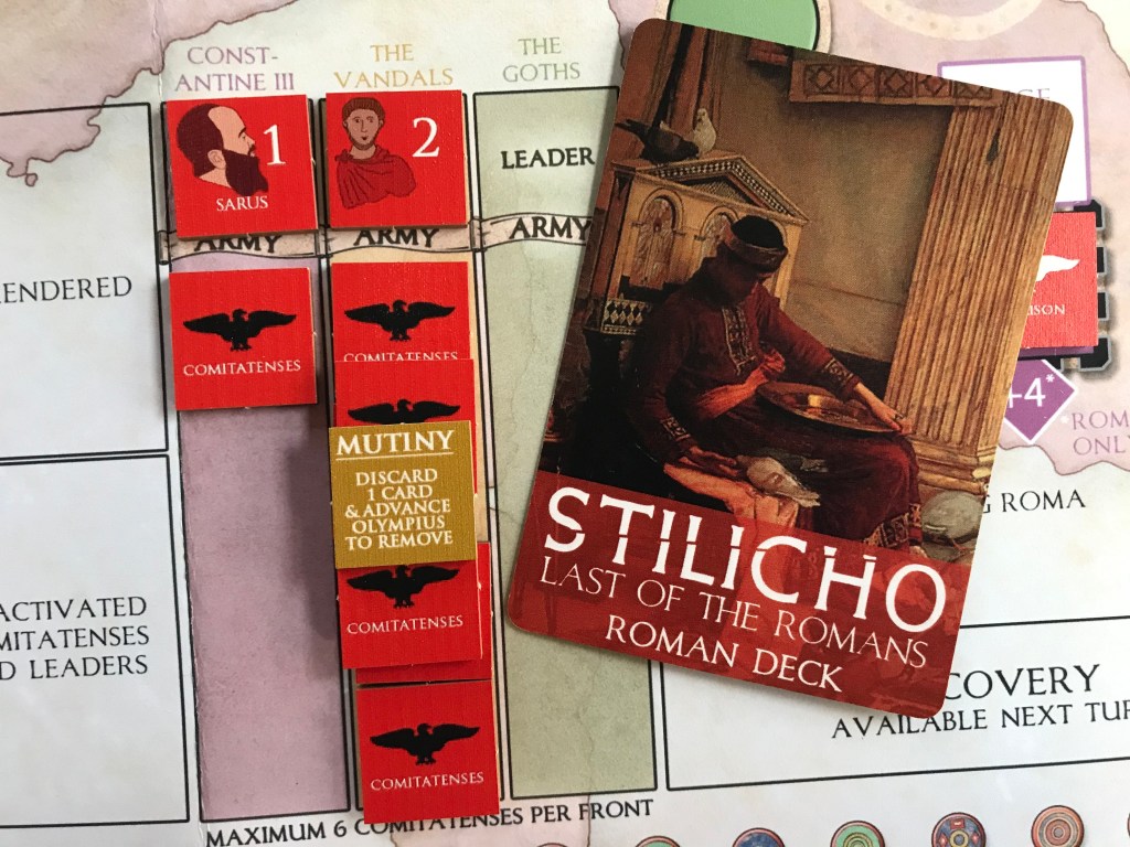 As the result of Enemy Event Cards, one of the Roman Armies might find themselves stuck in a Mutiny. Until this Mutiny is resolved and the Mutiny Marker is removed, that Army cannot Attack the Enemy. When the player discards a card to take this Action, the Mutiny Marker is removed and Olympius must also be advanced one space.