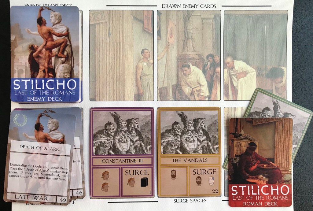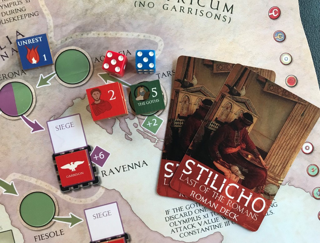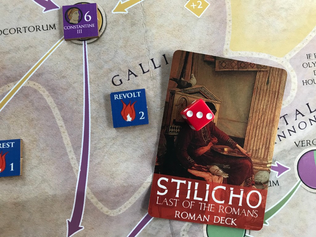 Last year, I discovered a great solitaire game called The Wars of Marcus Aurelius from Hollandspiele that dealt with the Romans attempting to pacify Barbarian hordes from the north in the Danube provinces during the Marcomannic Wars in 170-180 AD. Now the designer has taken that system and applied it to another period in Roman history when the Goths and Vandals, as well as a pretender named Constantine, were assaulting Rome itself and one man was asked to defend her from her enemies. Flavius Stilicho was a high-ranking general who rose from humble beginnings to become one of the most powerful men in the Western Roman Empire. After many years of victories against a number of enemies, both barbarian and Roman, a series of political and military disasters finally allowed his enemies in the court of Honorius to remove him from power, culminating in his arrest and subsequent execution in 408.