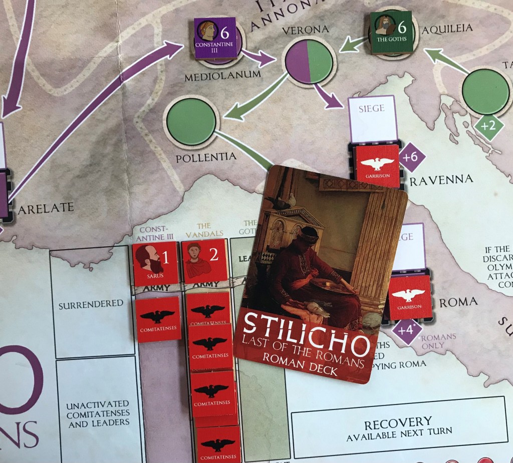 Move one Leader and/or up to 6 Comitatenses from one Army Box to another. This might be done because you have caused one Enemy to Surrender and want to not waste the rest of your turn and move your attention to another Front or if there has been crazy progress made by Constantine III on his Front and he is at the Gates of Ravenna knocking on the door (remember you will lose if Ravenna falls!). I like the flexibility in this Action but caution that you should use it only when you really have no other choice as you can reorganize at the start of a new Turn for free. If there is already a Leader present in the destination Army Box, the player can either switch places with the new Leader, or move that Leader to the Recovery Box.