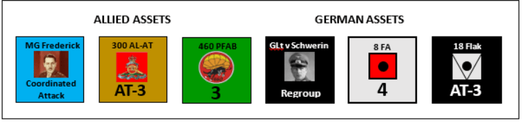 Dan: Assets are support units and special leader capabilities. The support units for both sides include indirect fire (heavy mortars, field artillery and coastal artillery) and anti-tank guns. Allied leaders can seize the initiative (activate their Command without drawing the chit) or coordinate an attack by units of both commands. German leaders can re-group units—this is the only way German units can add steps. Assets are randomly drawn, two assets per side on Turns 2-6. The assets are divided into two groups, those available on Turn 2, and a second group that becomes available on Turn 4 (start of D+1). For the Allies, starting assets represent only those that parachuted in on the morning of D-Day. Most of the Allied heavy weapons units arrive later by glider, and are not available till Turn 4. The German starting assets represent units located nearby, with additional heavier weapons arriving on D+1. Assets are assigned to a Command, and may only support units of their respective command.