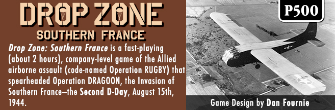 Drop Zone: Southern France portrays the Allied airborne assault that spearheaded Operation DRAGOON, the Invasion of Southern France—the Second D-Day, August 15th, 1944. Early on the morning of D-Day, the allied 1st Airborne Task Force (1st ABTF) parachuted a dozen miles behind the Riviera landing beaches to seize key towns and road junctions, to prevent the German occupation forces from counter-attacking the amphibious landing, and to facilitate the advance of Allied forces. The 1st ABTF was composed of the American 517th Parachute Regimental Combat Team (PRCT), the 509th and 551st Parachute and 550th Glider Infantry Battalions and the British 2nd Parachute Brigade. The defending German forces included the LXII Corps’ 242nd Infantry Division and counter-attacking forces of the 148th Reserve Division and Kampfgruppe von Schwerin. The 4:00 AM parachute drop was badly scattered due to an unexpected dense fog bank that blanketed the battlefield. Drop Zone: Southern France covers the first two days of this airborne operation in six tense turns, when the American and British paratroopers and glider-men fought surrounded and alone, supported only by French resistance bands.
