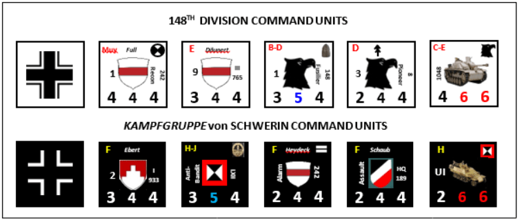 Dan: The German player begins with only two companies on the board, so almost all his forces arrive as Reinforcement Companies. There are 10 reinforcement entry areas (A thru J) around the board edge. The 148th Division Command units arrive in Areas A thru E and sometimes J (northeast, east and southeast edges). The Kampfgruppe von Schwerin units arrive in areas F thru J (northwest, west and southwest edges). Each Reinforcement Company is marked with its area(s) of entry. The German units are divided into two groups, for D-Day (Turns 1-3) and D+1 (Turns 4-6). A specified number of units are randomly drawn to arrive each Turn. The D-Day units are each marked with a single entry area, replicating the German practice of immediately attacking paratroopers with the nearest unit. The D+1 units have 2-3 possible entry areas, reflecting the increasing German ability to react, plan and direct. The D+1 German units are also stronger, as the German were able to bring higher quality units to bear on the second day. This system for German reinforcement arrival unintentionally turned out to be well suited for the solitaire system.