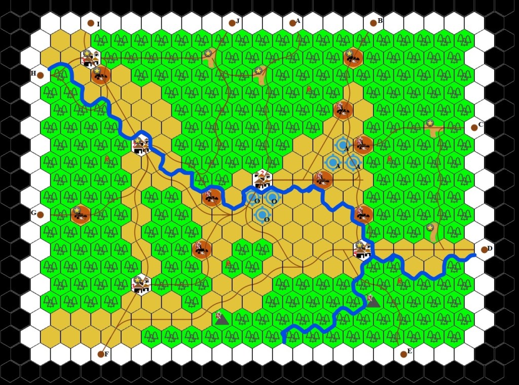 Turn 2-3: German units move towards Drop Zone A or Landing Zone O, making favorable attacks along the way. This reflects the German attempt to break up the airhead and prevent further landings.