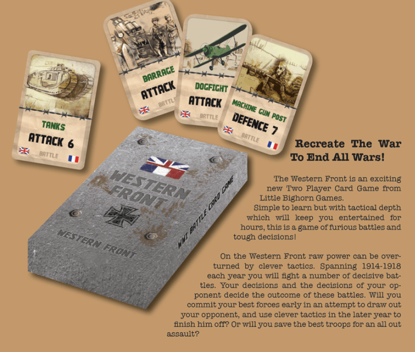 Western Front is a two player card game where players assume the role of commanders in the armies of the Kaiser’s Germany or the Entente Powers. during World War I. Battles are fought over 5 rounds representing the years 1914-1918 and the first player to achieve 3 years is the winner. Cards represent units and can provide attack or defensive values. Each player reveals their units simultaneously to determine net results before the option of playing additional cards. Committing units to the fight and employing sound tactical decisions will help achieve victory, however unpredictable events can dramatically alter the battlefield.