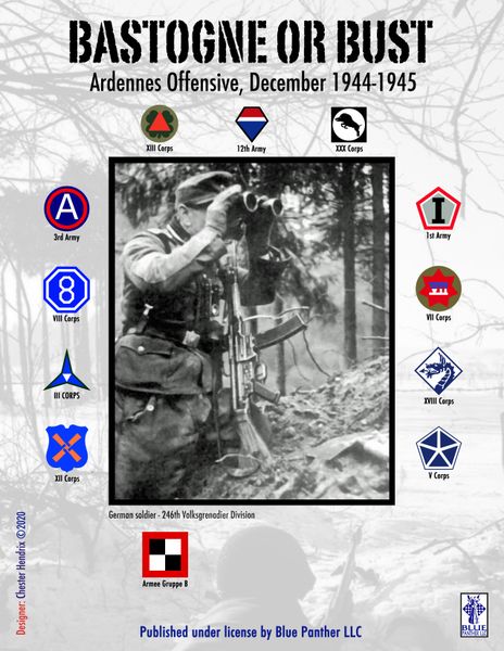 Chester: Paul chose me to put a Bulge title in his stable and I was happy to accommodate him. After two years, I was approached by Blue Panther (for the same reason) and made arrangements with Paul to release the rights back to me so I could license BOB to Blue Panther as a publisher. Bastogne or Bust – Designers Edition is the current iteration as of 2020.