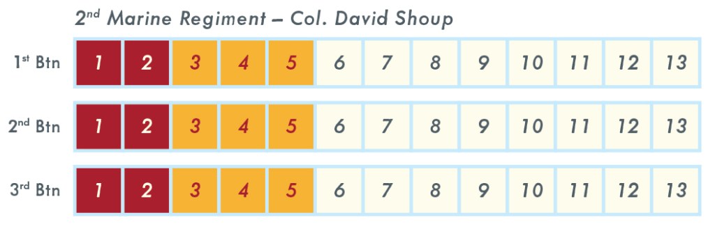 Grant W: Each “position” on the island and in the waves is made up of three rectangular boxes. The Japanese defenders are generic in the sense that they are a combined force for what was on the island. Each of the 3 regiments in the 2nd Marine Division are made up of between 2 to 3 battalions with each battalion having 3 blocks. Each turn it will be a battalion (or 3 if you have the Command Coordination card!) that you will activate to move and have combat.