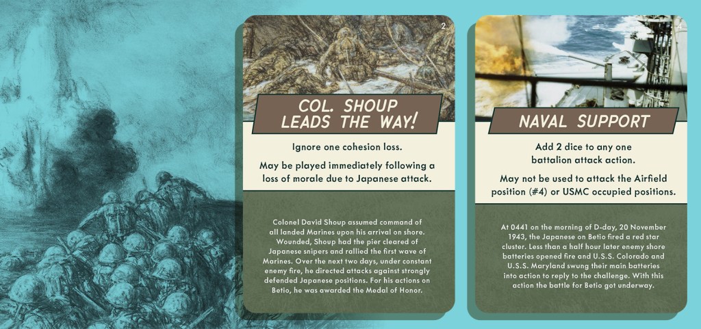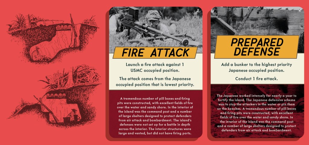 Grant W: The Japanese AI is card driven based on the positions occupied by the USMC battalions. There is an entire deck that is specifically used as the AI and from which actions will be provided. The card system prioritizes attacking the Marines on the beaches and in the water. I’m actually very proud of how well it works.