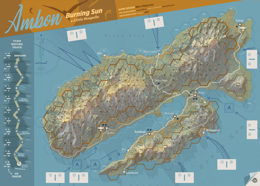 Ambon: Burning Sun & Little Seagulls is a two player wargame simulating the battle of Ambon, that took place between 30th January and 3rd February 1942 in the island of Ambon, in the Moluccas. A Japanese force composed of the 228th Regiment of the 38th Division of the IJA and the 1st Kure Special Naval Landing Force occupied the island against a force composed of the Dutch Molukken Brigade and the Australian “Gull Force”.