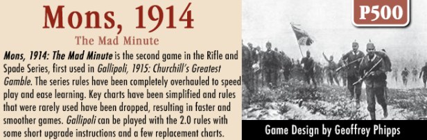 Mons, 1914: The Mad Minute is the second game in the Rifle and Spade Series, first used in Gallipoli, 1915: Churchill’s Greatest Gamble. The series rules have been completely overhauled to speed play and ease learning. Key charts have been simplified and rules that were rarely used have been dropped, resulting in faster and smoother games. Gallipoli can be played with the 2.0 rules with some short upgrade instructions and a few replacement charts.