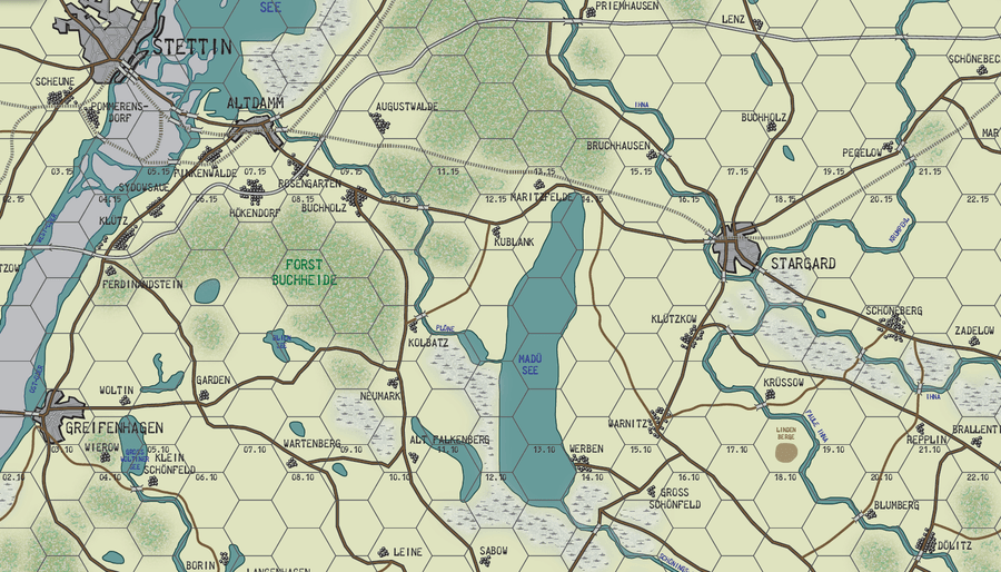 Stargard Solstice starts with one of the last German offensives of 1945, ‘Operation Solstice’. At the beginning Guderian had planned a pincer move to relieve Küstrin, but Hitler wanted to save troops to retake Budapest. This resulted in changing objectives to the relief of Festung Arnswalde and trying to cut the Soviet supply route towards Küstrin. The historical objective for the Soviets was to drive the Germans out of Pomerania and thereby protect their right flank while preparing to take Küstrin and make the final thrust towards Berlin. Stargard Solstice is a game recreating this campaign in Pomerania from 15th February – 6th March, 1945.