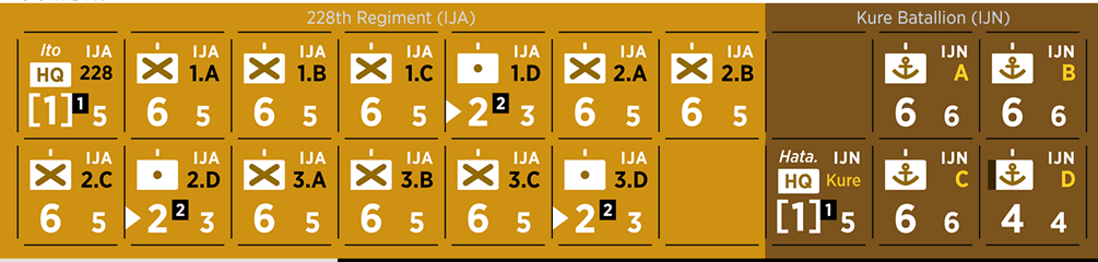 Marc: During setup, the Japanese player must place the marines (Kure force) and one of the infantry battalions in any two 1st wave boxes and then, the two remaining infantry battalions in any two 2nd wave boxes. The 1st wave units will land (or try to land) on the first turn. If they are successful, the units in the 2nd wave will advance to the 1st wave box and will land (or try to land) on the second turn.