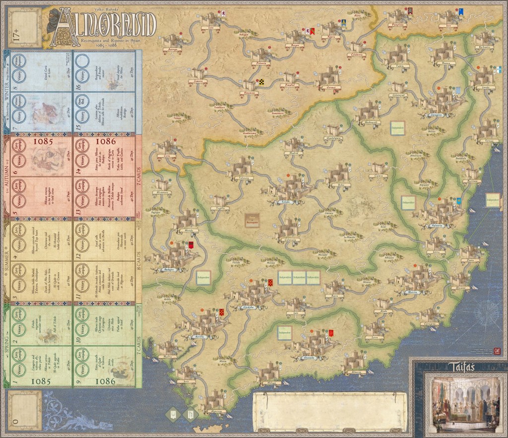 Almoravid – 965 [+49 orders, made the cut!] – Volume II in the Levy & Campaign Series that focuses on 11th century Spain and the battle between the Moors and Christians. We posted an interview with designer Volko Ruhnke last year. In the Art Department: Anticipated Shipping 5-9 months. Here is a look at a near final map: