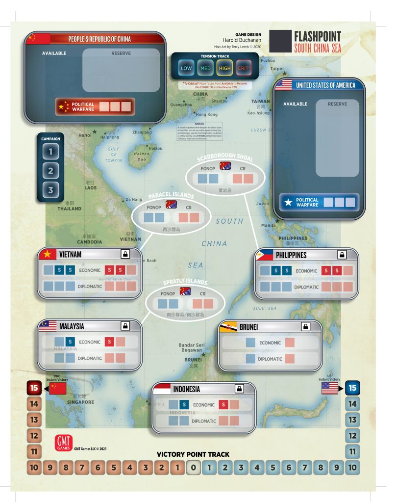 Flashpoint: South China Sea – 771 [+22 orders, made the cut!] – Another new entry in the Lunchtime series that was announced last year and for which the first entry is Fort Sumter. The South China Sea is a source of great concern for the West and this game looks at the struggle between China and the rest of the world over influence and control in this contested quadrant of the world. We were lucky enough to meet up with the designer Harold Buchanan at GenCon 2018 and got to play and shoot a video interview on the game. In the Art Department: Anticipated Shipping 5-9 months. Here is a look at the near final map: