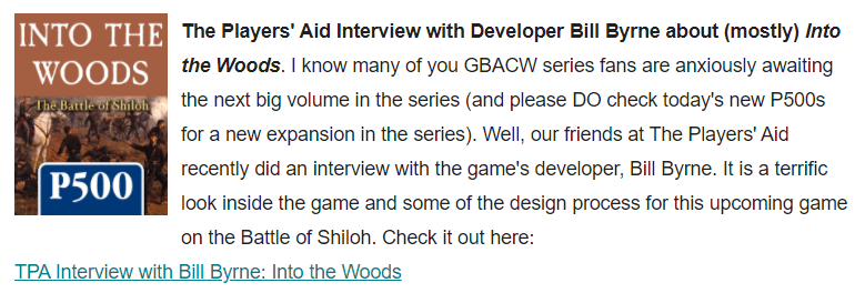One other thing. It is always very cool to see a post that we have on our blog or YouTube Channel appear in the Monthly Update. This month we posted an interview with Bill Byrne the developer for the upcoming Into the Woods: The Battle of Shiloh and Gene highlighted it in the top half of the email. This has driven well over 800 views of that interview since and we appreciate the traffic as well as the opportunity to cover these great games during the design and development process. I always tell designers that they should contact me by email at theplayersaid@gmail.com to get started on one of these interviews.
