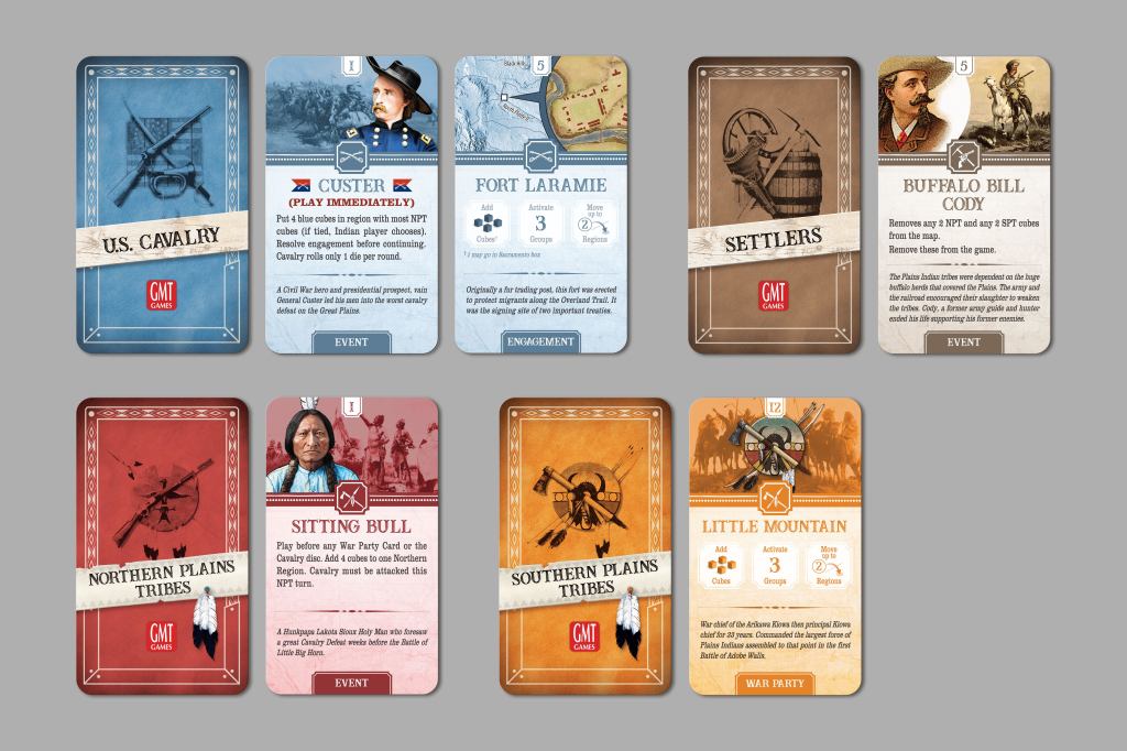 Plains Indian Wars – 572 [+22 orders, made the cut! thanks to a mystery donor] – A great game that looks at the inevitable wars between the expanding United States and the proud Native American tribes of the west. Read our interview on the game with John Poniske. We posted a few videos on this one to help push it on up toward the P500 goal. Review video and How to Play video. How far this one has come! After being announced as being in danger of being removed from the P500 in late 2019 if orders didn’t pick up an anonymous donor bought the remaining +/- 100 copies to get this one printed. In Final Art and Next to Get a Print Slot: Tentative Shipping approximately 4-6 months. Here is a look at the near final cards: