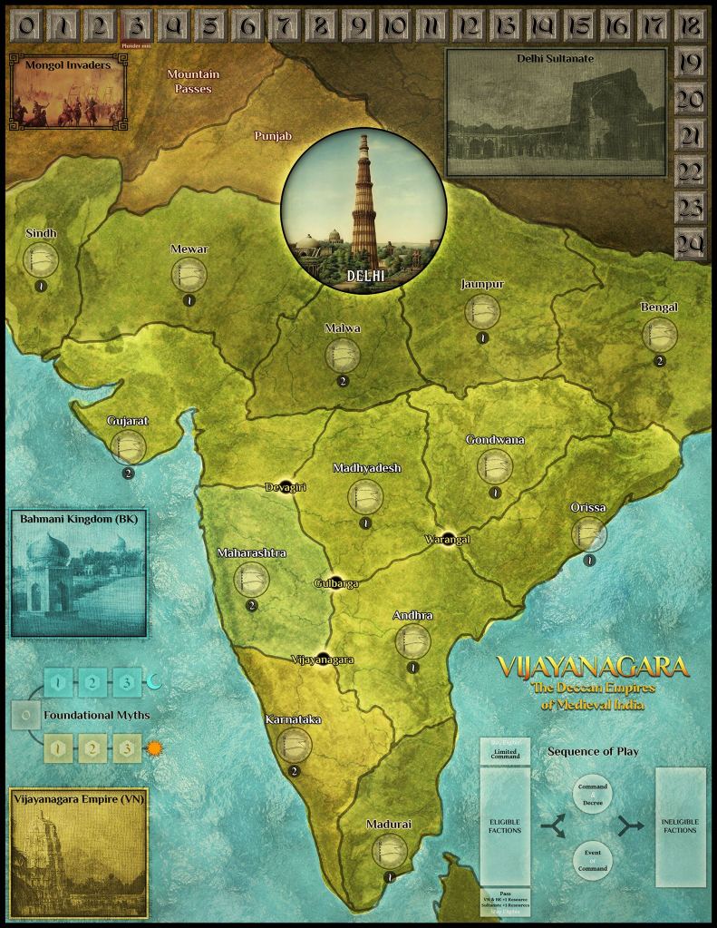 Vijayanagara is where…players will take on the asymmetric roles of the Delhi Sultanate, the Bahmani Kingdom, and the Vijayanagara Empire, navigating event cards and unique action menus as they contest to write themselves into medieval Indian history. Players will rally local amirs and rajas to their cause, construct epic temples, forts, and qasbahs, and battle for supremacy over the Deccan plateau.