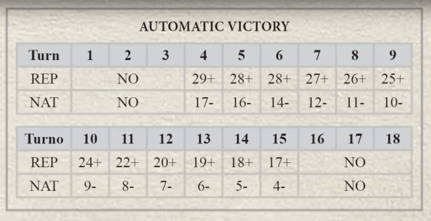 David: Victory conditions for each scenario are based on Victory Points levels. There are also automatic victory conditions based on Republican Morale level. So both players must pay attention to both factors.