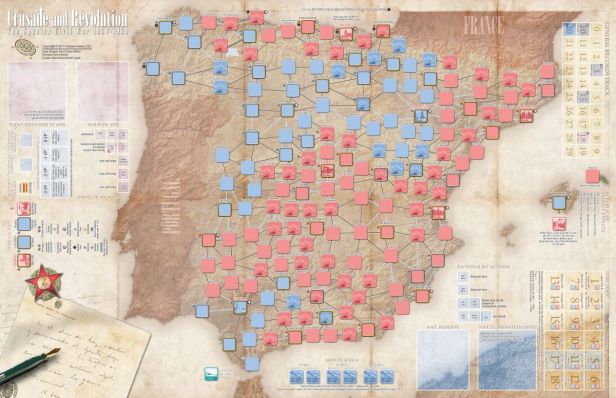 David: It is a card-driven point-to-point movement strategic-operational wargame that covers all the Spanish Civil War from 1936-1939. Its rules are based on Ted Raicer’s Paths of Glory. Each player takes command of one of the sides in the struggle, either the Nationalists or Republicans, and looks after all the aspects that involve a war: mobilization, recruitment, movement of troops, offensives, construction of defenses, etc. There are also historical events that must be taken into consideration, such happenings as the foreign military aid, international policy, change of Republican Government, etc.
