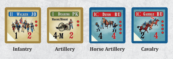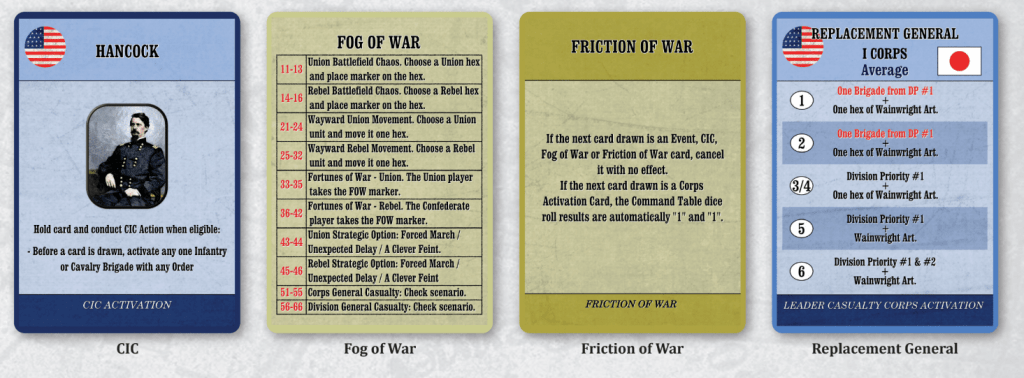 - Commander-in-Chief Cards: the commanding officers in each army are represented by this card. Actually, in the Union army, there are a few of these cards as various generals stepped up and took battlefield command at key moments of the battle. This card allows the players more flexibility in commanding units or manipulating the card draws.