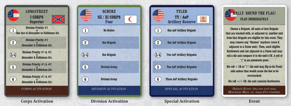 - Division Activation Cards: these cards do not go in the draw deck. Instead, these are placed on their respective Command Displays in priority order within the Corps to which they belong. The first Division Card (Division Priority #1) is the most likely to be activated when the Corps card is drawn. The second Division Activation card is less likely, but still possible with a good Corps commander or a lucky roll. The third Division will rarely activate through the normal activation process … you need some other things to happen to get those units into the action.