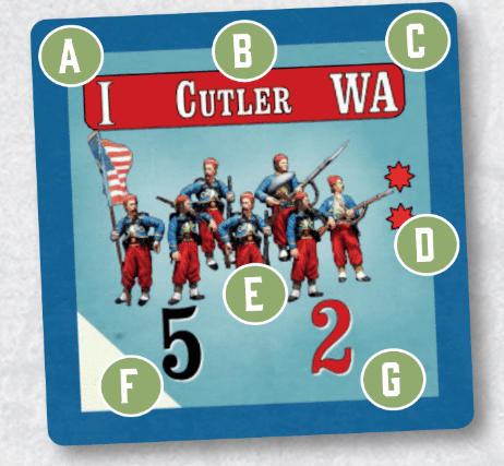 Hermann: These units are the same scale as used in The Devil’s To Pay … so they are each made up of from one to four regiments each, depending on how they were deployed at the battle. For example, the Iron Brigade has three counters – one is made up of the 24th Michigan and 19th Indiana regiments, the second is the 2nd and 7th Wisconsin and the third unit is the lone 6th Wisconsin regiment, because it was detached on the first day’s battles and fought alongside Cutler’s Brigade. So the game has the necessary flexibility of deployment in order that players can, if they wish, replicate the movements of the actual units at the battle. Or they can do something entirely different. As far as types of units, there are the standard units for any ACW game – infantry, artillery and Union cavalry. However, there are multiple variations to the graphics on the unit counters, including Zouaves, the Irish Brigade, the US Sharpshooters, etc. The counter art is very immersive.