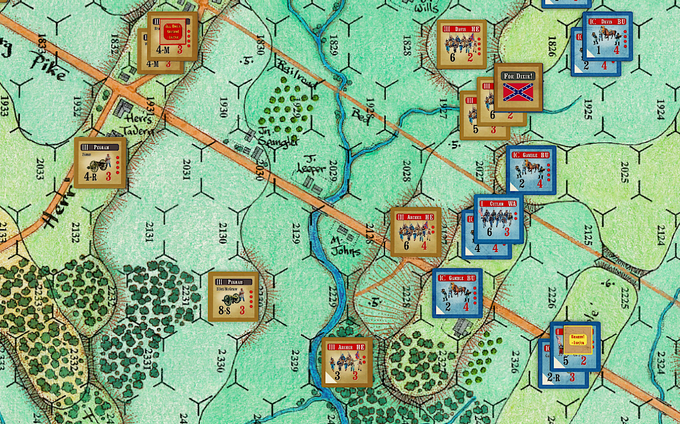 Hermann: Well, obviously all the basic elements of any Civil War battle are there and the system is already built to accommodate those overall historical characteristics. Specifically to Gettysburg, there were a few things that needed to be highlighted. Buford’s troopers are well represented and we had to make sure that they were able to do what they did historically as far as delaying the Confederate advance. Also, leader casualties are a huge factor in this battle, especially regarding Reynolds and Hood, so that aspect is a very important element but also is not “scripted”. Other interesting factors are the unique natural features of Devil’s Den, the Railroad Cut and Gettysburg itself, all of which have special consideration in the design. Finally, the evolution of the battle with its varying stages and acts is key to studying how things happened as they did and why. Therefore, reinforcement schedules and formation availability are key design features so that players will be presented with the same strategic and tactical situations as the real commanders.