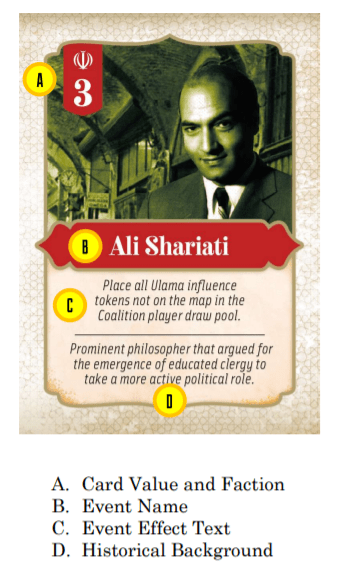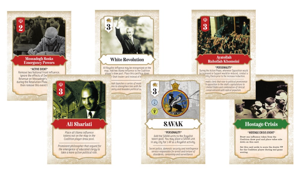 Dan: Leader Cards are essential to how each player scores. Mossadegh, Qavam, the Shah and Khomeini each have a Leader Card, but Mehdi Bazargan is an event card that can also be played into the leader box. When a player has a leader in power, they can bury one card during the turn to avoid triggering the event and add the value to their end game score. Each leader has a unique scoring capability, a condition under which they lose support, and an influence cost for triggering their faction’s events when played by their opponent. Khomeini coming to power triggers the end of the game, so he only adds to the Coalition score. Yes, some games will end without Khomeini coming to power, it is possible.