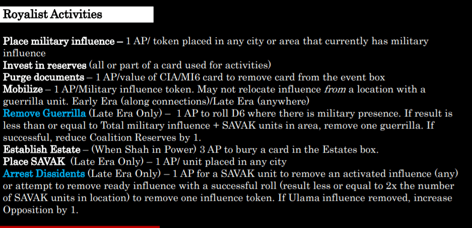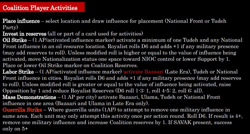 Dan: As in my other CDG’s, each player role has a unique menu of actions. The Royalist player actions primarily use the military (and later SAVAK) to limit the impact of labor and oil strikes, remove guerrillas and arrest dissidents. The Coalition actions are based around labor strikes (to increase opposition), oil strikes (to push nationalization or lower support), mass demonstration (to lower support for the shah or preserve it for Mossadegh) and guerrilla strikes (to remove chip away at Royalist influence and give Coalition points for future actions).